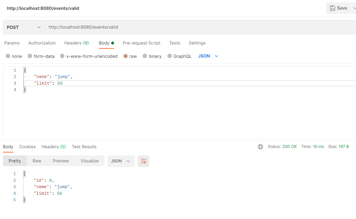 @Controller public class SampleController { @PostMapping("/events/valid") @ResponseBody public Event getEvent(@RequestBody @Valid Event event, BindingResult bindingResult) { if(bindingResult.hasErrors()) { System.out.println("======================="); bindingResult.getAllErrors().forEach(c->{ System.out.println(c.toString()); }); } return event; } public class Event { private int id; // Not Null @NotNull private String name; // 최소 30 @Min(30) private Integer limit; public int getId() { return id; } public void setId(int id) { this.id = id; } public String getName() { return name; } public void setName(String name) { this.name = name; } public int getLimit() { return limit; } public void setLimit(int limit) { this.limit = limit; } }
