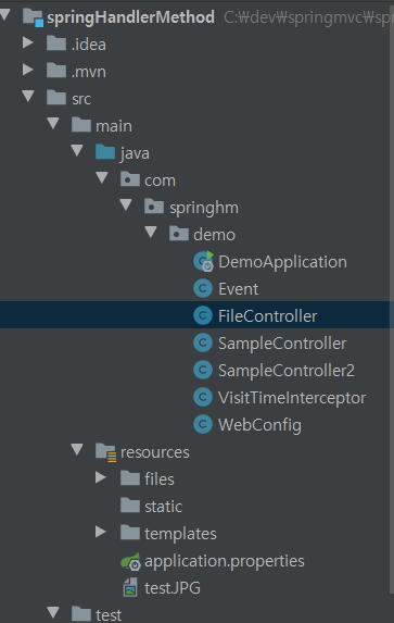 @Controller public class FileController { @Autowired private ResourceLoader resourceLoader; @GetMapping("/file") public String fileUploadForm() { return "files/index"; } @PostMapping("/file") public String fileUpload(@RequestParam MultipartFile file, RedirectAttributes attributes) { // Save 로직 String message = file.getOriginalFilename() +" is uploaded"; attributes.addFlashAttribute("message", message); return "redirect:/file"; } // 다운로드 @GetMapping("/file/{filename}") @ResponseBody public ResponseEntity<Resource> downloadFile(@PathVariable String filename) throws IOException { // 위치 resources 디렉터리에 있는 test.jpg 파일 Resource resource = resourceLoader.getResource("classpath:" + filename); File file = resource.getFile(); Tika tika = new Tika(); String type = tika.detect(file); return ResponseEntity.ok() .header(HttpHeaders.CONTENT_DISPOSITION, "attachement; filename=\"" + resource.getFilename() + "\"") .header(HttpHeaders.CONTENT_TYPE, type) .header(HttpHeaders.CONTENT_LENGTH, String.valueOf(file.length())) .body(resource); } }test.jpg 파일 위치