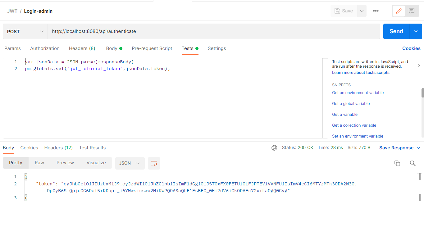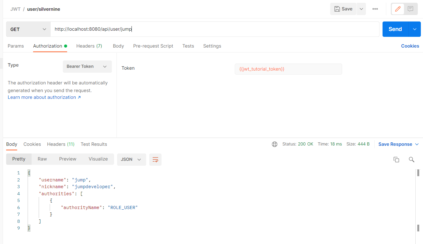 아래와 같이 Authorization Type을 지정하고, 포스트맨 전역 변수(jwt_tutorial_token)에 담았던 Token을 사용하여 권한 검증을 한다.