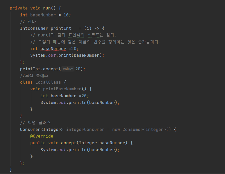 위의 스크린샷 처럼 변수의 값이 변경되면 컴파일 에러가 난다. (final, effective final일 경우에만 참조 가능)