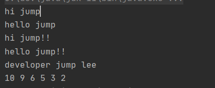 ex:) Supplier<Greeting> newGreeting = Greeting::new;public class App { public static void main(String[] args) { // 람다식 // parameter : String, return : String Function<String, String> hi = (s)->"hi "+s; System.out.println(hi.apply("jump")); // hi jump // paramter랑 return type이 같은경우 UnaryOperator<String> hello = (s) -> "hello "+s; System.out.println(hello.apply("jump")); // hello jump // 메소드 레퍼런스 // 정적 메소드 UnaryOperator<String> hi2 = Greeting::hi; System.out.println(hi2.apply(" jump!!")); // Greeting의 hi 정적 메소드를 hi2에 저장하고 apply를 통해 호출 // hi jump!! // 인스턴스 메소드 Greeting greeting = new Greeting(); UnaryOperator<String> hello2 = greeting::hello; System.out.println(hello2.apply(" jump!!")); // 인스턴스 메소드는 위와같이 객체가 생성되어야 호출가능하다. // hello jump!! // 객체 생성 Supplier<Greeting> newGreeting = Greeting::new; Greeting greeting1 =newGreeting.get(); UnaryOperator<String> newGreetingMethod = greeting1::hello; newGreetingMethod.apply("jump !!!!"); // Greeting 객체 생성 후 hello 메소드 호출 // hello jump !!!! // Array Sort (응용) String [] names= {"jump","developer","lee"}; Arrays.sort(names,String::compareToIgnoreCase); for(String name :names) { System.out.print (name+ " "); } System.out.println(); Integer [] num = {3,5,9,2,10,6}; Arrays.sort(num,(a,b)-> b-a); for(Integer i : num) System.out.print(i+" "); } }결과 :