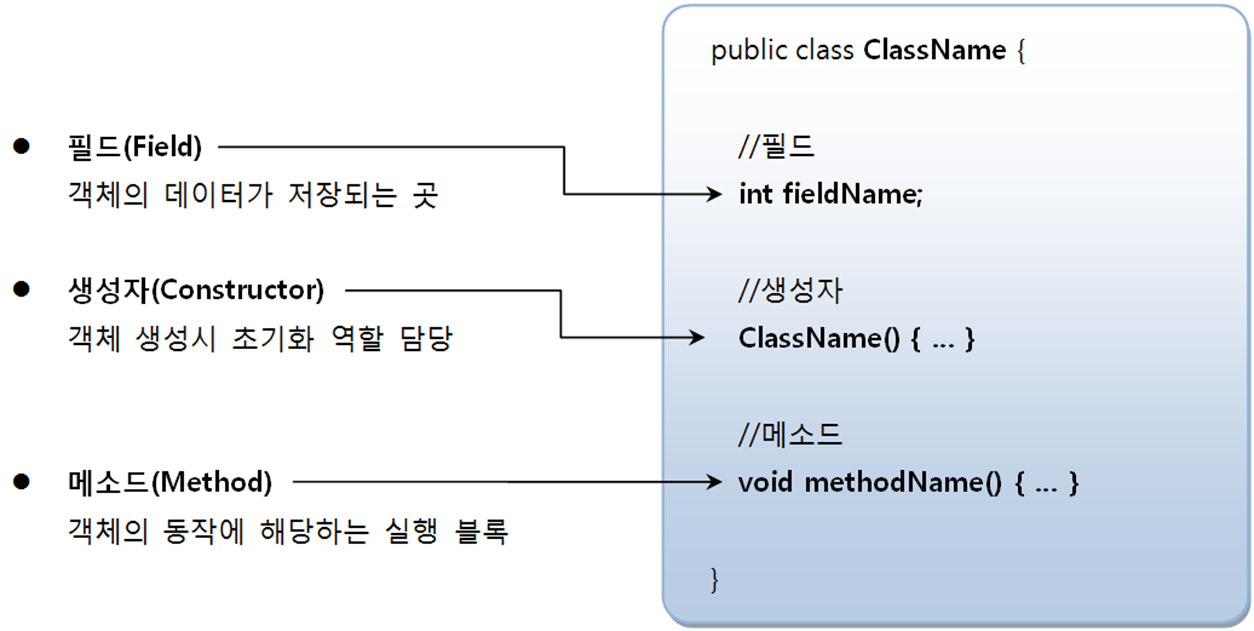 클래스는 설계도, 클래스에는 객체를 생성하기 위한 필드와 메서드로 정의되어 있음.