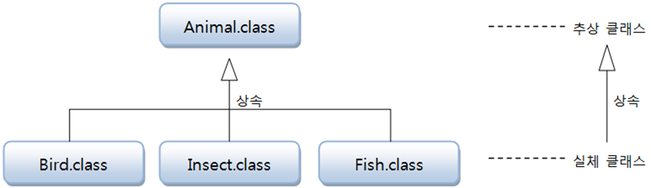 예 : 새, 곤충, 물고기 -> 동물(추상)