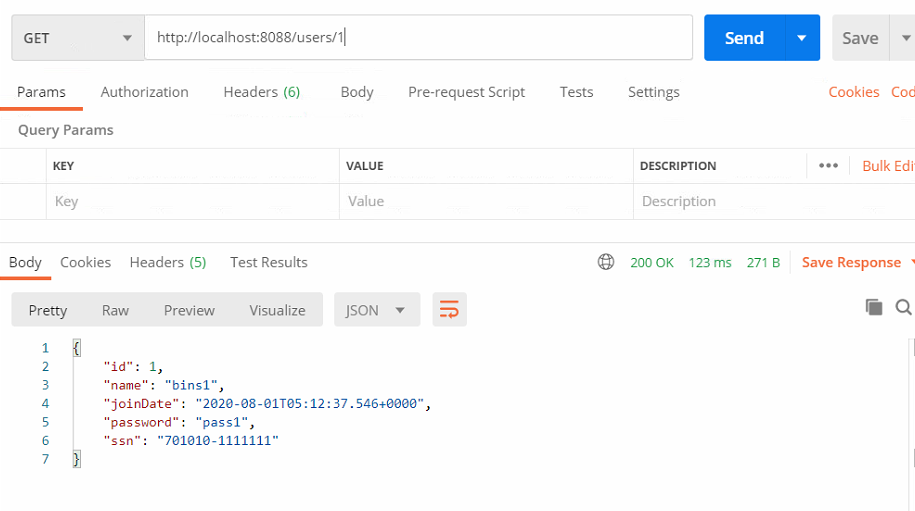 package com.example.demo.user; import java.net.URI; import java.util.List; import org.springframework.http.ResponseEntity; import org.springframework.web.bind.annotation.DeleteMapping; import org.springframework.web.bind.annotation.GetMapping; import org.springframework.web.bind.annotation.PathVariable; import org.springframework.web.bind.annotation.PostMapping; import org.springframework.web.bind.annotation.RequestBody; import org.springframework.web.bind.annotation.RestController; import org.springframework.web.servlet.support.ServletUriComponentsBuilder; import javax.validation.Valid; @RestController public class UserController { private UserDaoService service; public UserController(UserDaoService service) { this.service = service; } @GetMapping("/users") public List<User> retrieveAllUsers() { return service.findAll(); } // GET /users/1 or /users/10 -> String @GetMapping("/users/{id}") public User retrieveUser(@PathVariable int id) { User user =service.findOne(id); if (user == null) { throw new UserNotFoundException(String.format("ID[%s] not found", id)); } return user; } }소스는 UserDaoService로 User 데이터를 가져오는 findAll, finsOne 메서드가 정의되어있다.