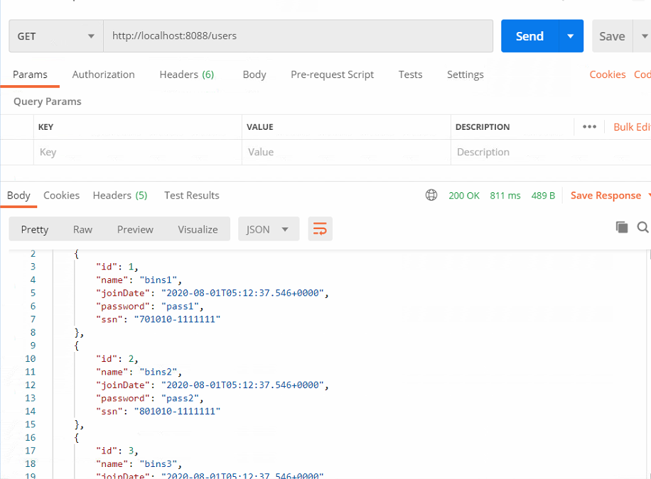 package com.example.demo.user; import java.util.Date; import lombok.AllArgsConstructor; import lombok.Data; import lombok.NoArgsConstructor; import javax.validation.constraints.Past; import javax.validation.constraints.Size; @Data @AllArgsConstructor @NoArgsConstructor public class User { private Integer id; @Size(min=2, message ="Name은 2글자 이상 입력해 주세요.") private String name; @Past private Date joinDate; //@JsonIgnore private String password; // @JsonIgnore private String ssn; }결과 :