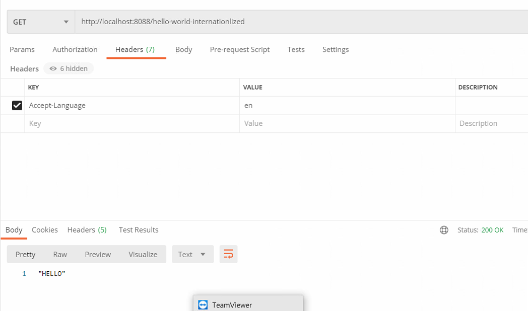package com.example.demo.helloworld; import org.springframework.beans.factory.annotation.Autowired; import org.springframework.context.MessageSource; import org.springframework.web.bind.annotation.GetMapping; import org.springframework.web.bind.annotation.PathVariable; import org.springframework.web.bind.annotation.RequestHeader; import org.springframework.web.bind.annotation.RestController; import java.util.Locale; @RestController public class HelloWorldController { @Autowired private MessageSource messageSource; @GetMapping(path= "/hello-world-internationlized") public String helloWorldInternationalized( @RequestHeader(name="Accept-Language", required = false) Locale locale) { return messageSource.getMessage("greeting.message",null,locale); } } 위와 같이 messageSource의 메시지를 가져오는 메서드를 실행하면 Locale 값에 따라 다르게 설정파일(messages.properties 파일)을 읽어오는 것을 알 수있다.