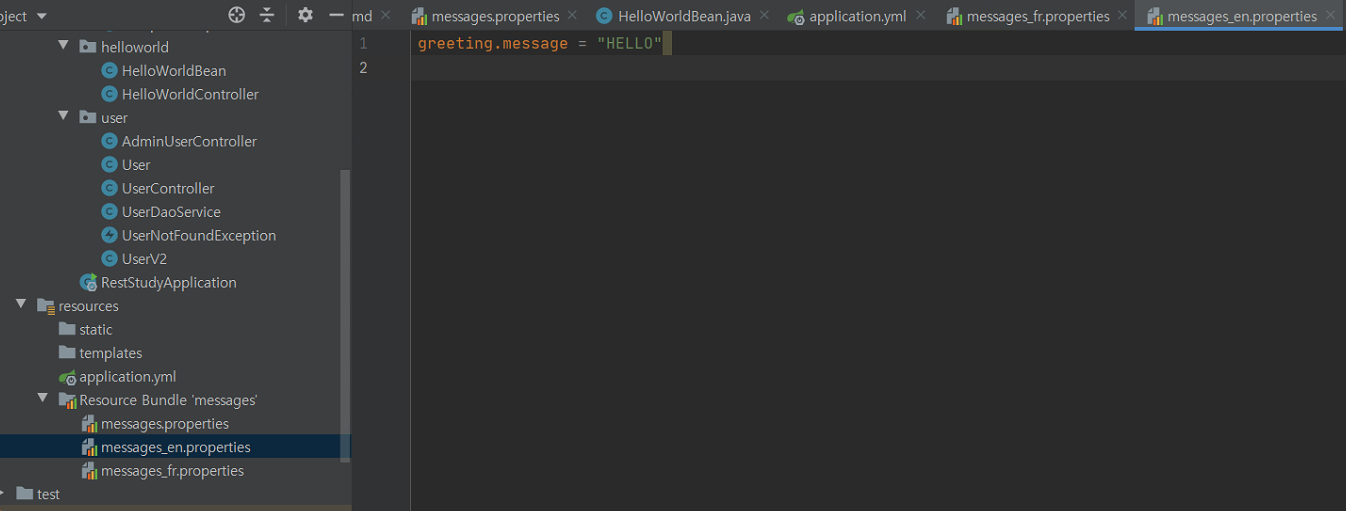 package com.example.demo; import java.util.Locale; @SpringBootApplication public class RestStudyApplication { public static void main(String[] args) { SpringApplication.run(RestStudyApplication.class, args); } // 다국어 처리 (한국어 기본설정) @Bean public LocaleResolver localeResolver() { SessionLocaleResolver localeResolver = new SessionLocaleResolver(); localeResolver.setDefaultLocale(Locale.KOREA); return localeResolver; } }다국어 처리 설정은 위와 같이 SpringBootApplication 파일에서 설정할 수 있다.