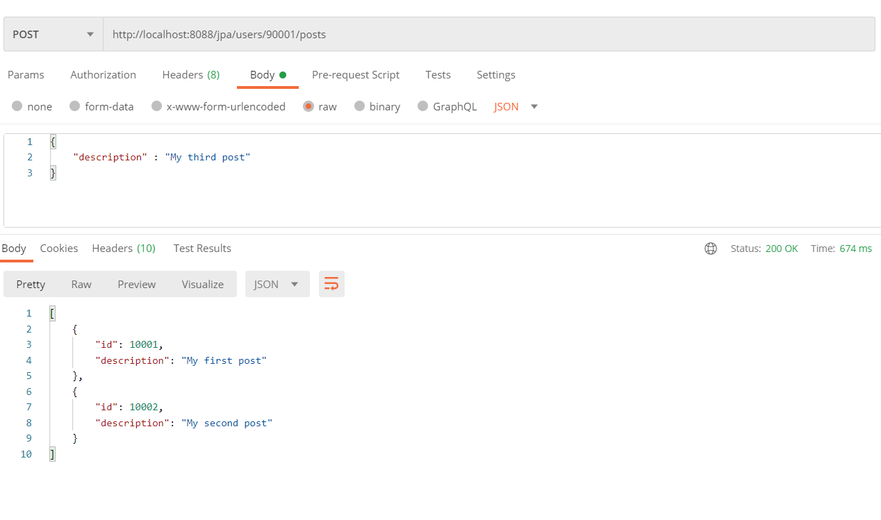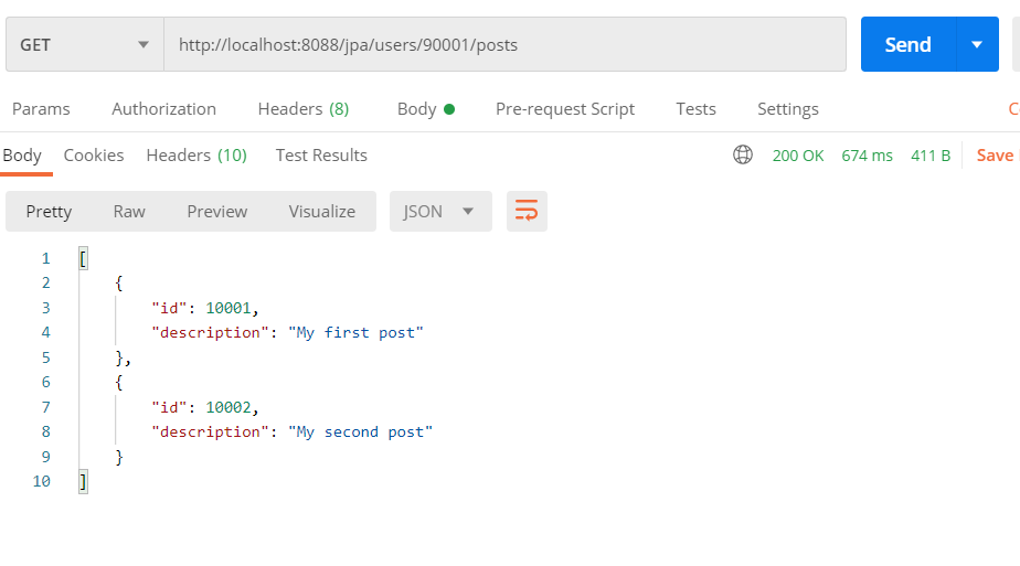 // jpa/users/90001/posts @GetMapping("/users/{id}/posts") public List<Post> retrieveAllPostsByUser(@PathVariable int id) { Optional<User> user = userRepository.findById(id); if(!user.isPresent()) { throw new UserNotFoundException(String.format("ID[%s] not found",id)); } return user.get().getPosts(); }