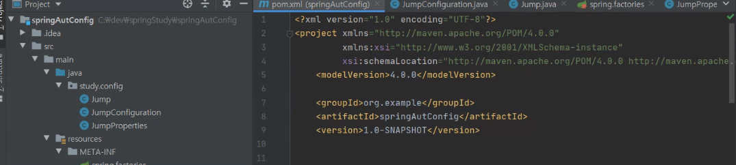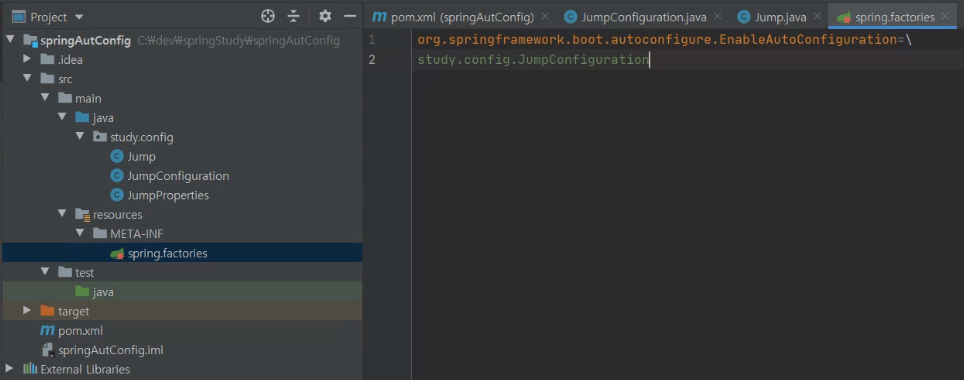 @ConfigurationProperties("jump") public class JumpProperties { private String name; private int age; public String getName() { return name; } public void setName(String name) { this.name = name; } public int getAge() { return age; } public void setAge(int age) { this.age = age; } @Override public String toString() { return "Jump{" + "name='" + name + '\'' + ", age=" + age + '}'; } }spring.factories 파일 생성