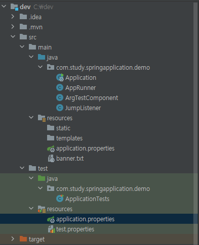 아래와 같이 test -> resources -> application.properties 를 생성해줍니다.