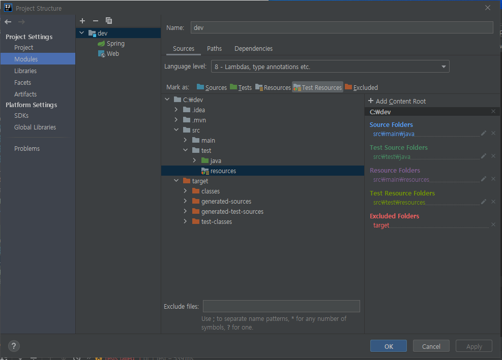 아래 화면과 같이 Modules 부분의 resources에서 Test Resources 폴더를 설정해줍니다.