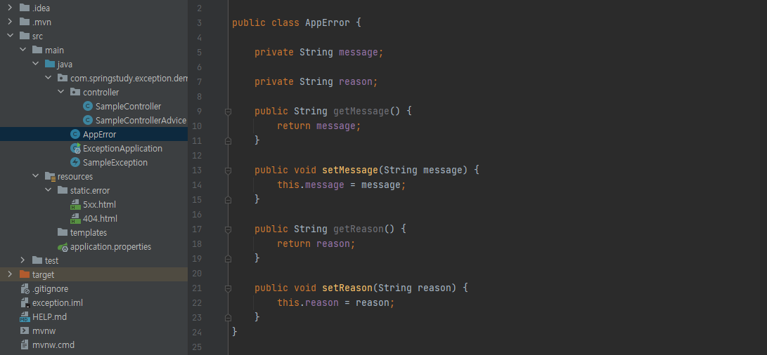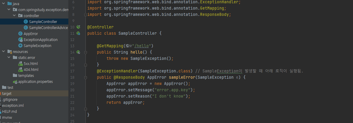 @ExceptionHandler를 사용하여 SampleException이 발생할 때 아래와 같은 메시지와 이유를 세팅하고 리턴하도록 합니다.