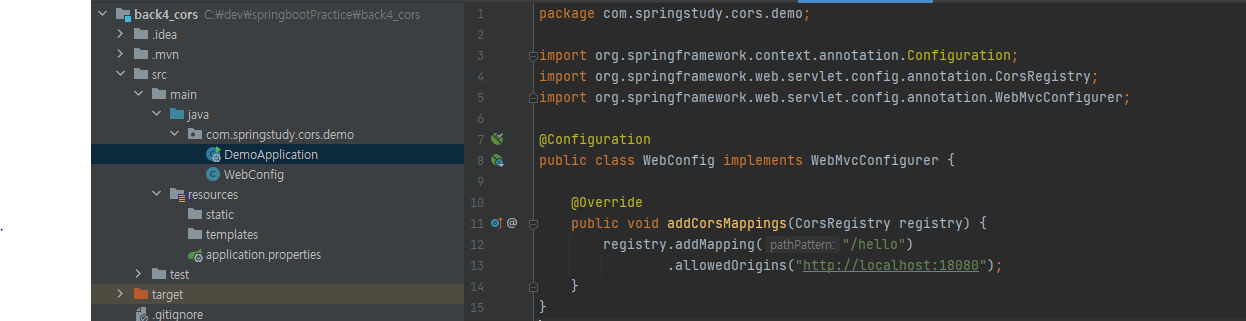 - addCorsMapping을 override해서 Mapping과 allowedOrigins 을 추가한다.