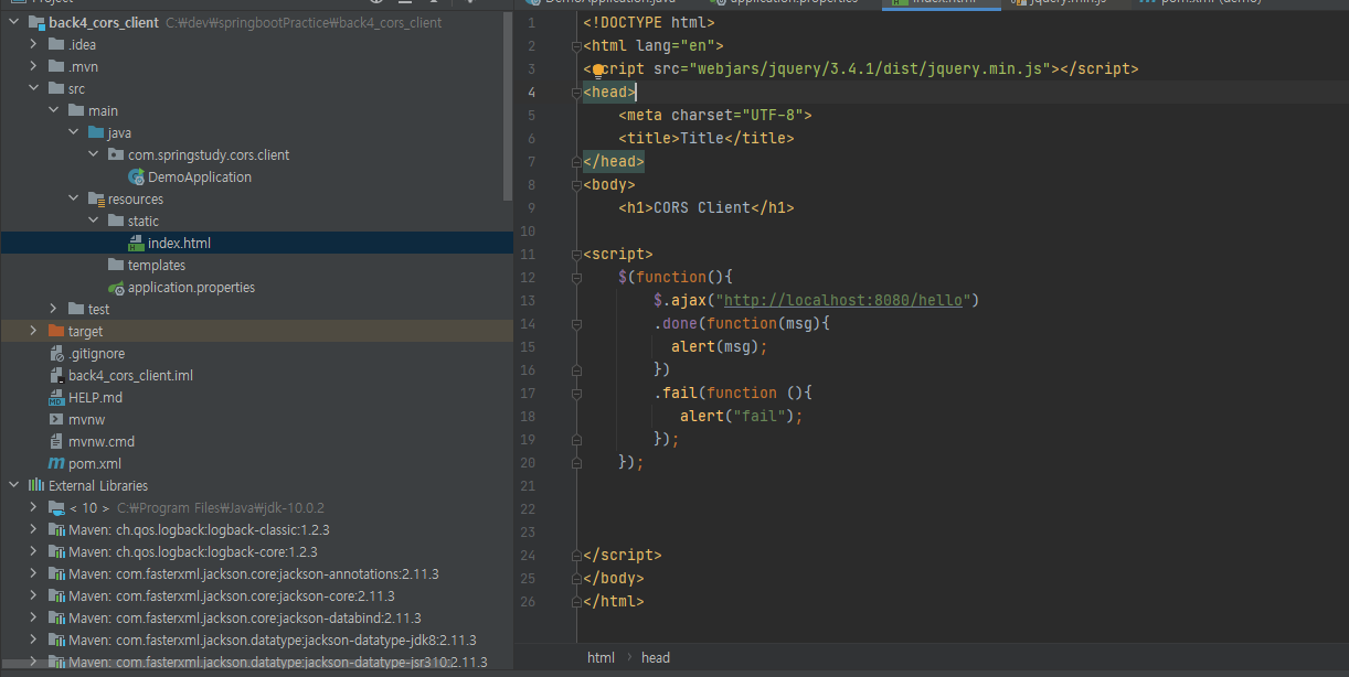 <dependency> <groupId>org.webjars.bower</groupId> <artifactId>jquery</artifactId> <version>3.4.1</version> </dependency>client 프로젝트와 server프로젝트 두개의 웹서버를 띄울 것이기 때문에 client 프로젝트에는 아래와 같이 port 번호를 별도로 설정해준다.