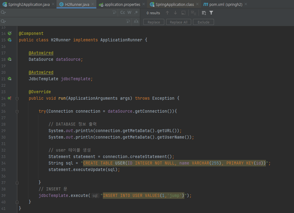 <dependency> <groupId>org.springframework.boot</groupId> <artifactId>spring-boot-starter-data-jdbc</artifactId> </dependency> <dependency> <groupId>com.h2database</groupId> <artifactId>h2</artifactId> <scope>runtime</scope> </dependency>Application.properties - H2 관련 설정