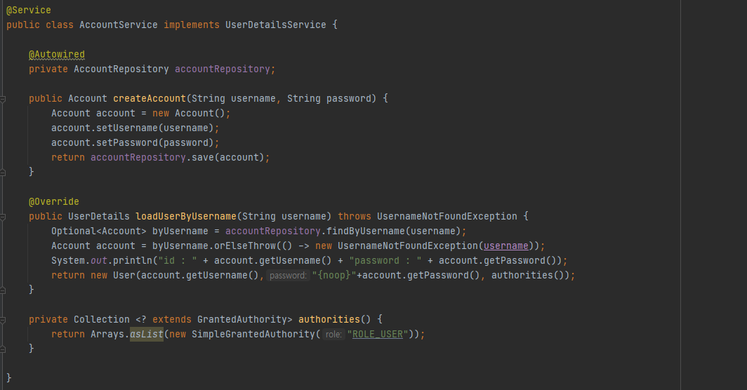 - loadUserByUsername : username을 이름을 기준으로 유저정보를 DB에서 조회하고, 데이터가 없을 시에는 NotFoundException을 발생시킴. 그 후 UserDetails의 구현체인 User를 리턴한다. User(username, password, 권한)