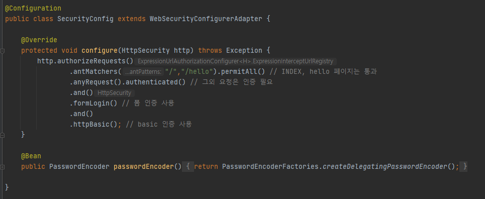 위와 같이 시큐리티 설정을 하는 클래스를 생성한다.