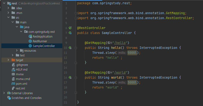 hello 메서드는 sleep을 5초를 주고, world는 3초를 준다.